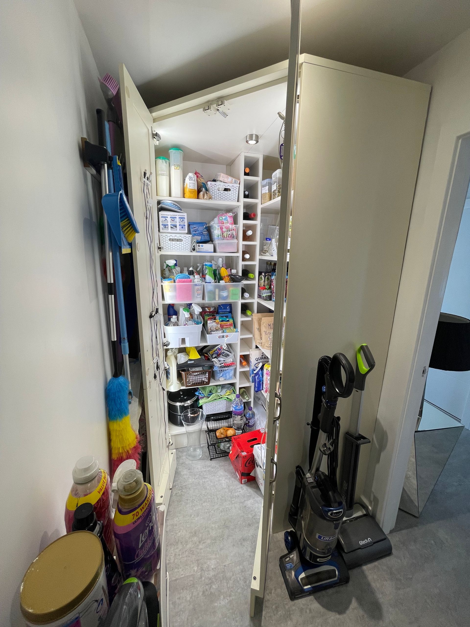 They made very good use of the space. And then the last thing that's been finished is a very old, tired bathroom. This has been finished fairly recently. It had a bath, it had two windows, one window was taken out and where the bath was now I've got lots of storage space for my collection of shoes.